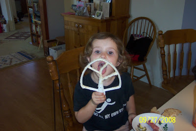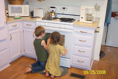 Andrea says that on Thursday afternoons we should just go about our normal home activities and that we don’t have to entertain Huck and Nell, but the truth is that they entertain us. Here are some pictures to prove it. The first one shows them in a game that Huck calls “pigs in rug.” Nell is sticking out the top while Huckle is sticking out the bottom. Next is sand art at the counter using a bunch of stuff Cindy got from free-cycle. After I went back to work, they made cookies with Cindy. Here they are in front of the oven watching them bake. The deal was they had to wait to eat them until they went to Granddaddy’s where they would share them at music night. Huck ate all of his dinner in anticipation of the “big” cookie he had shaped just for himself.