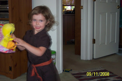 Here she is a little later a Dearma’s in her adorable little brown cotton dress with belt–a new outfit for school.