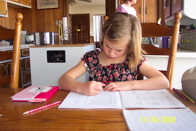 In preparation for Thanksgiving, the homeschoolers were cooking this week. In my morning shift, the pre-school kids made cornbread muffins while Anna Mae took her first stab at pie dough in preparation for making pumpkin pie. (Read more about her cooking activities on her blog.) Meanwhile at the afternoon shift, Candice was cooking along with more traditional school-work. Both girls share a particular look of concentration that goes with learning.