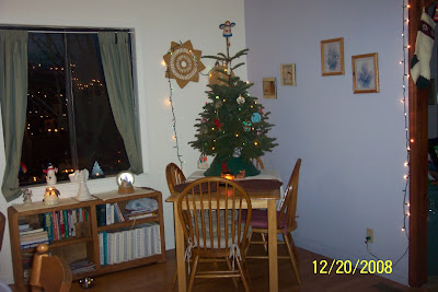 Today we put up our Christmas tree. Since we got the tree late and will be leaving on Christmas Eve, we decided on a little tree that we put on the dining room table. After we decorated the tree, we ate our dinner from plates set on festive red and green braided place mats in front of the tree. We had been decorating the clubhouse all afternoon for the big party tomorrow, so it was fun to extend the experience into our own home.