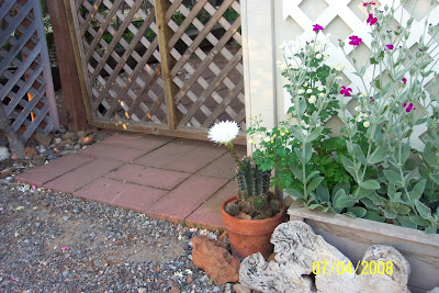 The cactus that was blooming this morning has a history as do many of my graden plants. I bought this guy at the yard sale the Tippett family held to raise money to bring Leon and Aliou to the US. The cactus was donated by Michael’s mother, who is also a Patricia. It quickly found a home by my back gate where it has been making babies for two years, but it had not flowered in the two previous summers that I had it. This is the second bloom on the plant this year, but I saw only a wilting version of the last one, making this morning’s flower all the more special.
