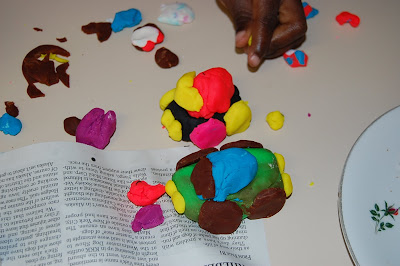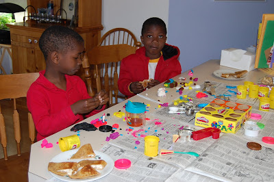 While their sister was sedated at the dentist, Leon and Aliou crafted cars from Play Doh and had a morning snack of chicken/cheese casa dia. (Notice the detail on their creations below.)