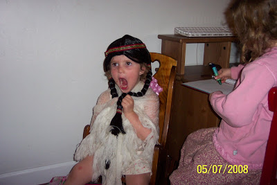 Posted on May 8, 2008Nell turned three yesterday. She patiently awaited the arrival of her guests, dressed in party clothes with streamers hanging above her head. The table was gaily arranged with place settings designed and made by brother Huckle. Knowing her propensity for dress up, family and friends gifted Nell with various costume accouterments which she promptly donned in various combination and with suitable expression.